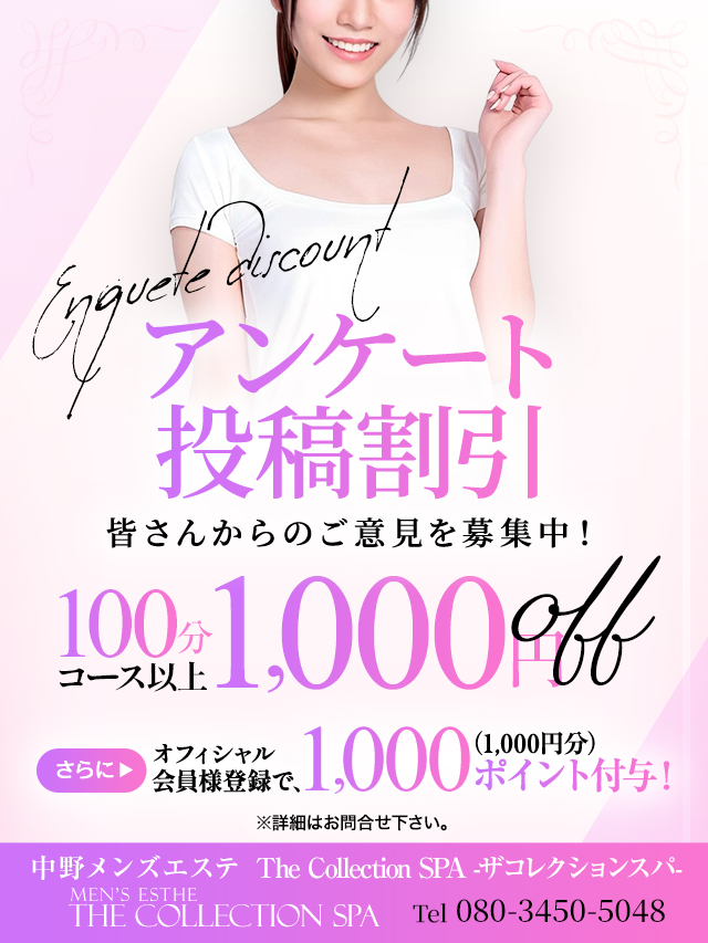 [01/05 23:22]♠アンケート投稿割引!ご意見をお聞かせ下さい♪投稿を頂いた方には、次回100分コース以上~1,000円OFF!さらに、オフィシャル会員登録で1,000(千円相当)ポイント付与致します♠…